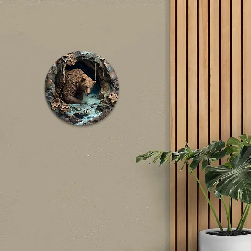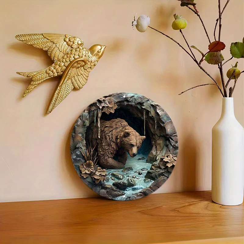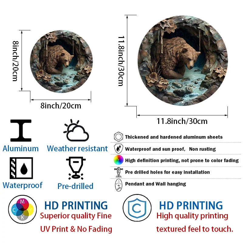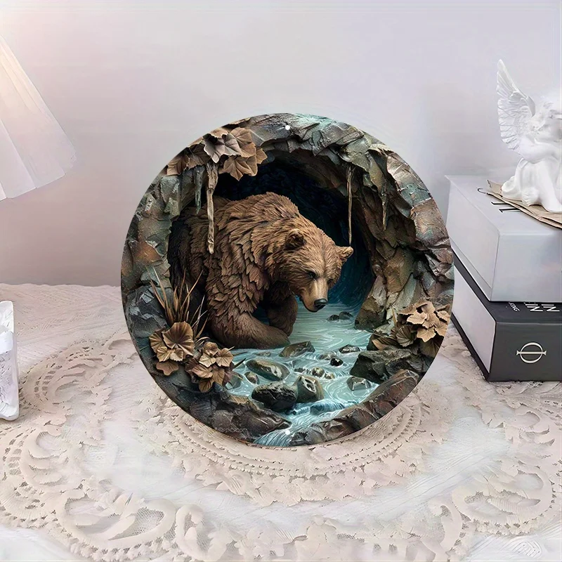 Panneau mural rond en aluminium avec scène de diversification d'ours brun rustique, degré UV et de rayures, facile à accrocher, décoration extérieure et intérieure